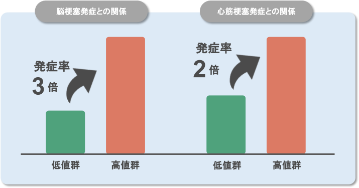 日本国内で行われた追跡研究の結果、LOX-index®の値が高いと、低い場合と比べて脳梗塞の発症率は3倍、心筋梗塞は2倍となることがわかっています。
