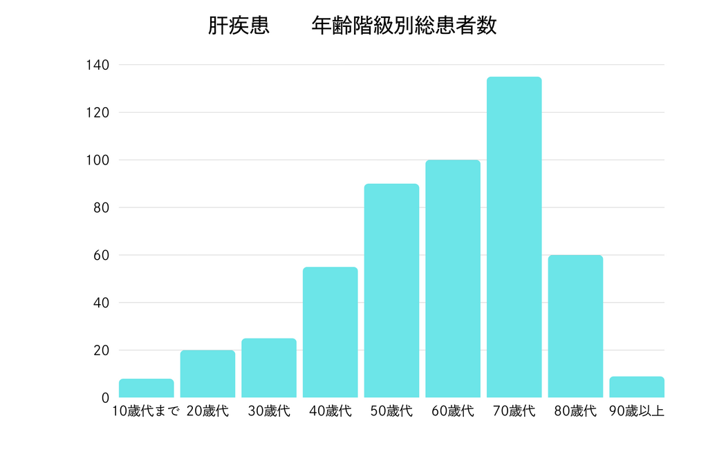 日本における肝硬変の患者数は約51万人といわれています。そのうち、9~30%が脂肪肝と考えられており、患者数はおよそ1000万人以上と推定されています。40歳代から患者数が増えてきて、70歳代でピークとなります。そのため、中高年世代の方にとって、肝臓のケアはより一層重要になります。