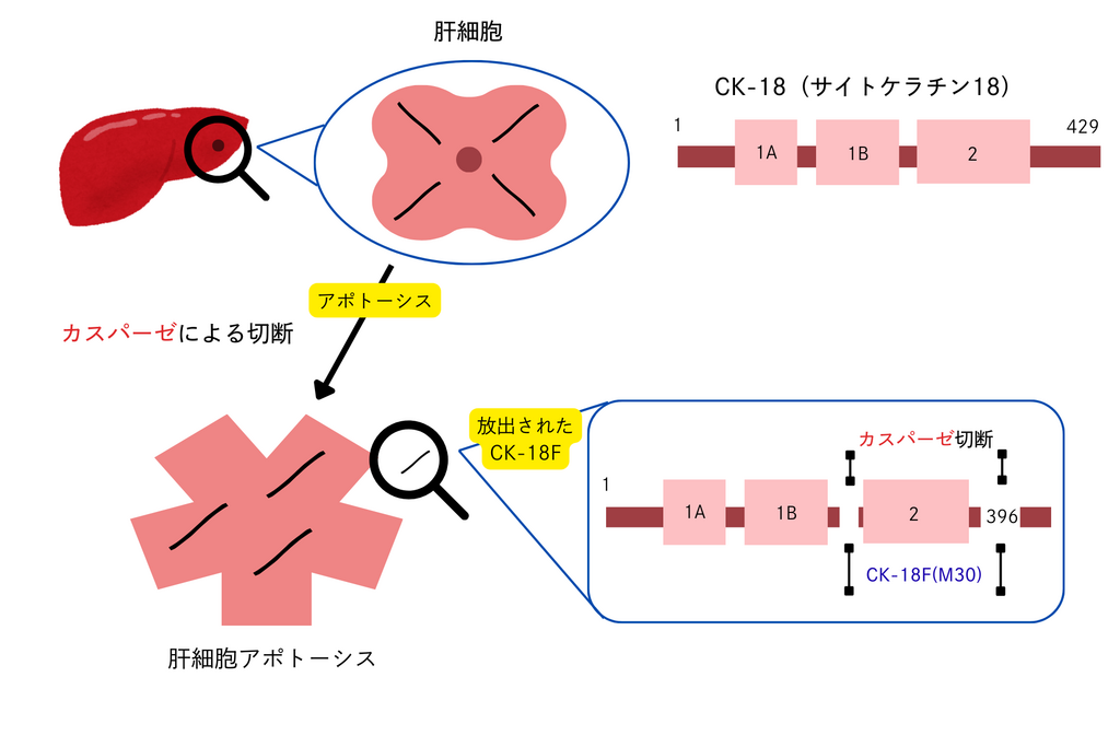 サイトケラチンは細胞骨格を形成するタンパク質の一種で、中でもCK-18は、肝細胞や上皮系細胞に多く存在し、肝臓のタンパク質の5%を占めています。CK-18Fは傷害を受けた肝細胞でアポトーシスが生じた結果、血液中に放出されます。